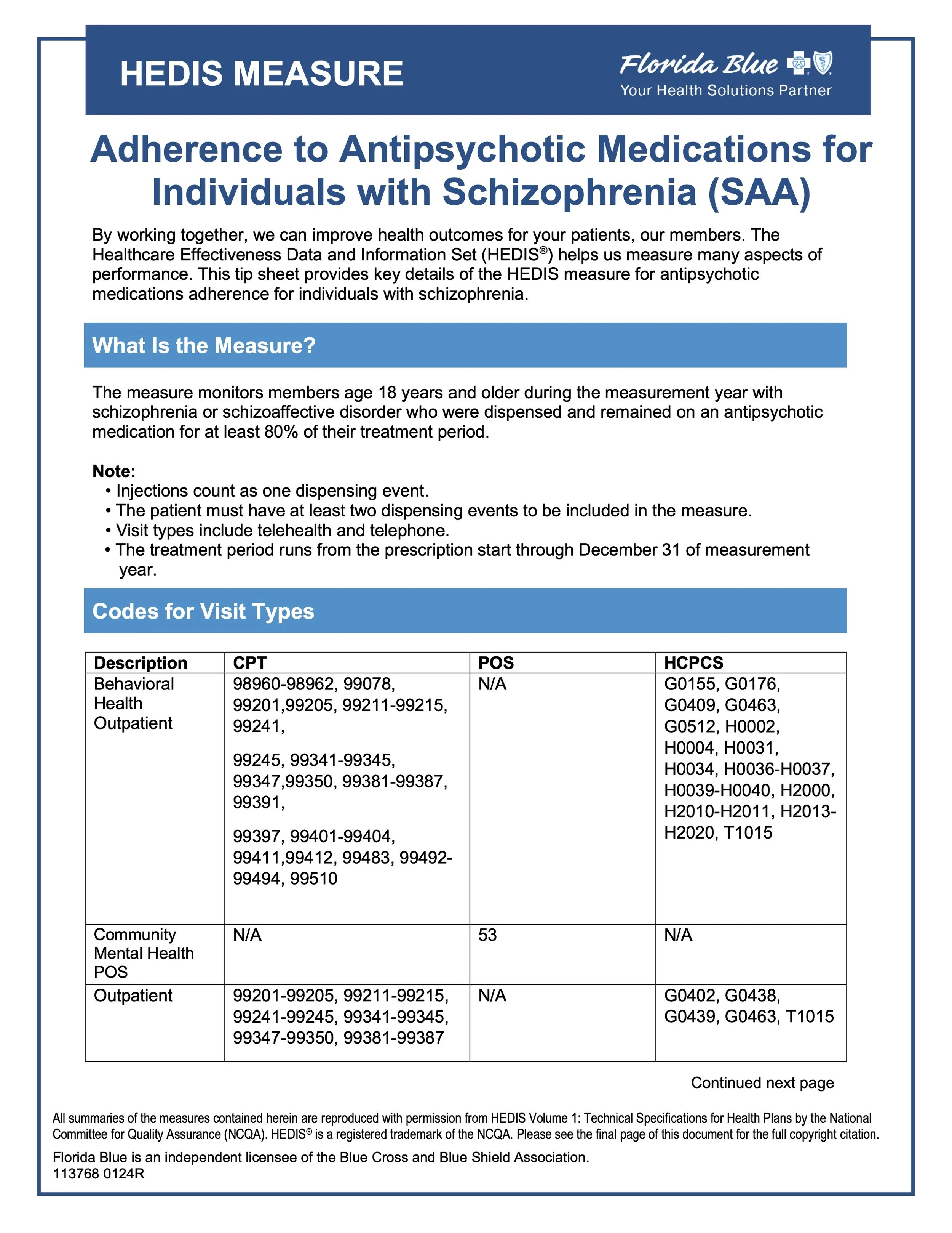 This HEDIS tip sheet summarizes the measurements for patient adherence to mental health medications for patients with schizophrenia.